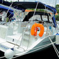 Radar, Bow thruster, GPS chart plotter, Electric anchor windlass, Bimini top, Sprayhood, Heating, GPS, Gas bottles, Outdoor speakers, Refrigerator, Hot water, Teak cockpit, Cockpit cushions, Coffee machine, Cockpit/stern, outside shower, Cockpit table, Kitchen utensils (Galley equipment, cutlery), Fenders, VHF radio, Navigation (Nautical) charts and nautical guide, First aid kit, Spare anchor (Reserve, Auxiliary anchor), Fire extinguisher, Hand bearing compass, Set of tools, Mooring ropes, Battery charger, Barometer, Clock, Water hose, Plastic bucket, Fog horn, Radar reflector, Boat hook, Bosun's chair (Safe seat) (boatswain's chair), Navigation set, Spotlight / Headlights, Shore connection 220 V, Windex, Wire (shroud) cutter, Harbour guides, Lazy bag, Lazy jacks, GPS chart plotter - cockpit, Composite steering wheels, Round/globular fender, Liferaft, Cockpit table with light, Hawser, Anchor line, Spring line, Main anchor, Gennaker-device, EPIRB-Distress radio beacons, Tridata, Black conus, Black ball, Anchor swivel, Flashlight, Life buoy + Flashing light, Self inflating life vest, Distress signals, Spyglass with bearing compass, Parallel ruler, Impeller, V-belt, oilfilter, Logge/Lot/Speed/Wind, AIS, Radio, USB sockets