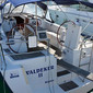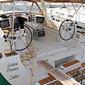 Bimini top, Sprayhood, Bow thruster, Hot water, Cockpit table, Roll main sail, Roll Genoa, Autopilot, Echo sounder, Speed log, Radio CD player, Electric windlass, Wind instrument, Winch handles, Gas bottle, Boat hook, Wind direction indicator, Water hose, Bilge pump + handle, Charts, Plotters + dividers, Hand bearing compass, Binoculars, Pilot books, Life jackets, First aid kit, Portable lamp, Clock, Barometer, Kitchen equipment, Generator, Air condition, Electrical fridge, Teak cockpit, Cockpit speakers, CD Player, Engine, GPS + CHART PLOTTER IN COCKPIT, Solar panels, Blue underwater lights, Bed linen