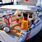 Electric refrigerator, Emergency tiller, Fenders, Gangway, Fire extinguisher, Hot water, Inverter, Lazy bag, Teak cockpit, Spare anchor, Binoculars, Distress signals, Cockpit table, Cockpit speakers, GPS plotter in salon, Furling Genoa, Autopilot, Bimini, Refrigerator, Dinghy, Sprayhood, Full Batten Mainsail, Gennaker, Chart plotter, Cockpit/stern outside shower, Electric anchor windlass, Heating, Radio CD + USB, Log, speed, Depth - echo sounder, Spinnaker, Wind instrument /Anenometer, First aid kit, Black ball, Black conus, Boat hook, Dinghy pump, Navigation charts, Navigation set, Fog horn, Battery charger